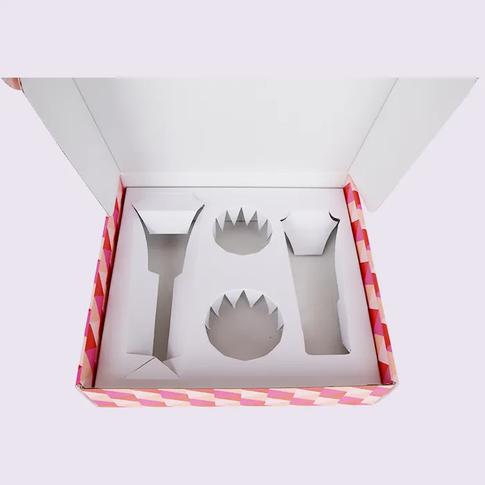 Қаптама кірістіру үшін біз бірнеше материалдарды қарастырдық: қағаз, пластмасса, көбік және экологиялық таза құйылған кірістіру. Сайып келгенде, біз қайта өңдеуге болатын қағаз кірістірулерді олардың төмен бағасы, тез өңдеу уақыты, қарапайымдылығы және экологиялық таза, биологиялық ыдырайтын табиғаты үшін таңдадық. Жеке күтімді жөнелтуге арналған қораптарға арналған қағаз кірістіру үшін арнайы қалыптарды қажет етпейді, сондықтан ешқандай қалып ақысы қажет емес. Doyoupack орауыш дизайнерлері үлгіге негізделген өлшемдерді, ұяшықтарды, ілмектерді және біріктіру мүмкіндіктерін реттейді, содан кейін кесу арқылы кірістіруді жасайды. Қағаз кірістіру бір бөліктен тұратын гофрленген материал — үнемді, толық биоыдырайтын және өте экологиялық таза. Ол өнімді жақсы көрсетіп қана қоймай, қолдау мен қорғауды қамтамасыз етеді. Ең бастысы, ол эко-қалыпты кірістірулермен, пластикалық кірістірулермен немесе сұр тақта кірістерімен салыстырғанда өнім жиынтығының жалпы салмағын айтарлықтай азайтады. Бір бөліктен тұратын гофрленген кірістіру және жеке күтімге арналған бір бөліктен тұратын жеткізу қораптары да тегіс тасымалдауды жеңілдетеді.